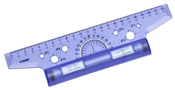 Содержит транспортир 180 градусов и трафареты окружностей.