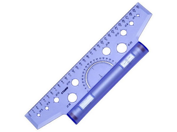 Содержит транспортир 180 градусов и трафареты окружностей.