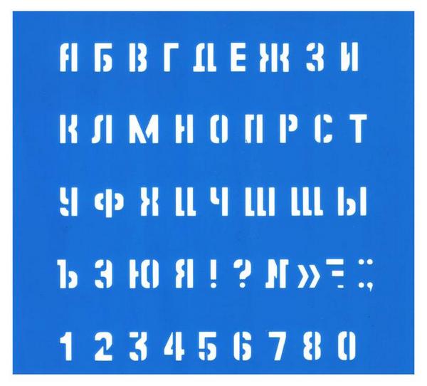 Содержит буквы русского алфавита, знаки препинания и цифры высотой 1 см.