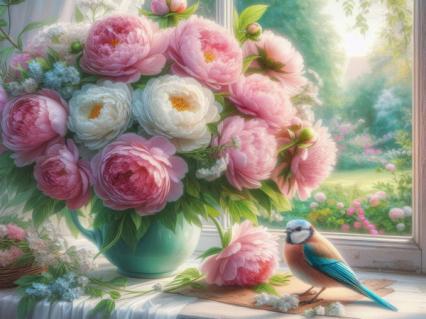 Алмазная мозаика с част. зап. 40*50 см ПП "Птичка и букет пионов" подрамник